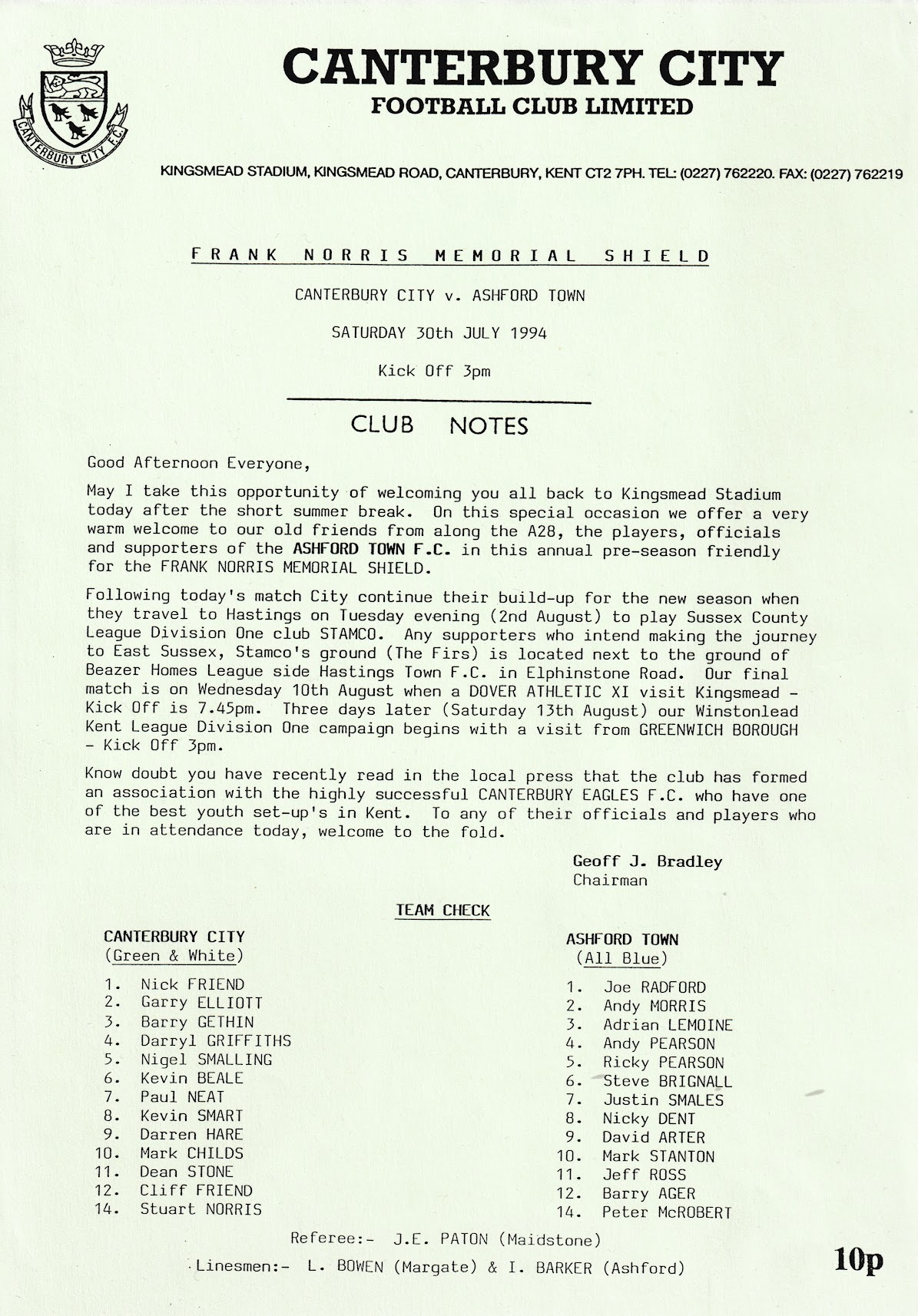 1994/95 30 Jul 1994 Canterbury City (A) Frank Norris Trophy 2-1 --- Programme